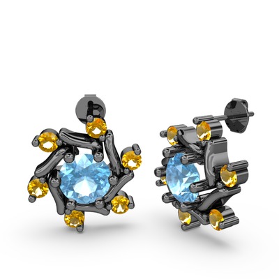 Sitrin ve akuamarin 925 ayar siyah rodyum kaplama gümüş küpe