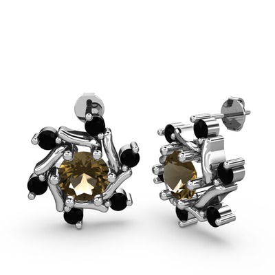 Siyah zirkon ve dumanlı kuvars 14 ayar beyaz altın küpe