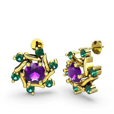Yeşil kuvars ve ametist 18 ayar altın küpe