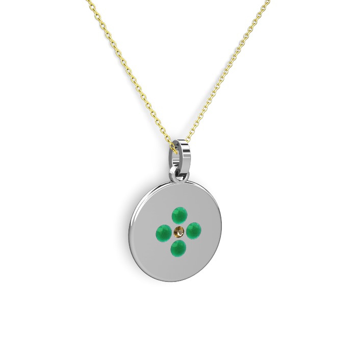 Dumanlı kuvars ve kök zümrüt 8 ayar beyaz altın kolye (40 cm gümüş rolo zincir)