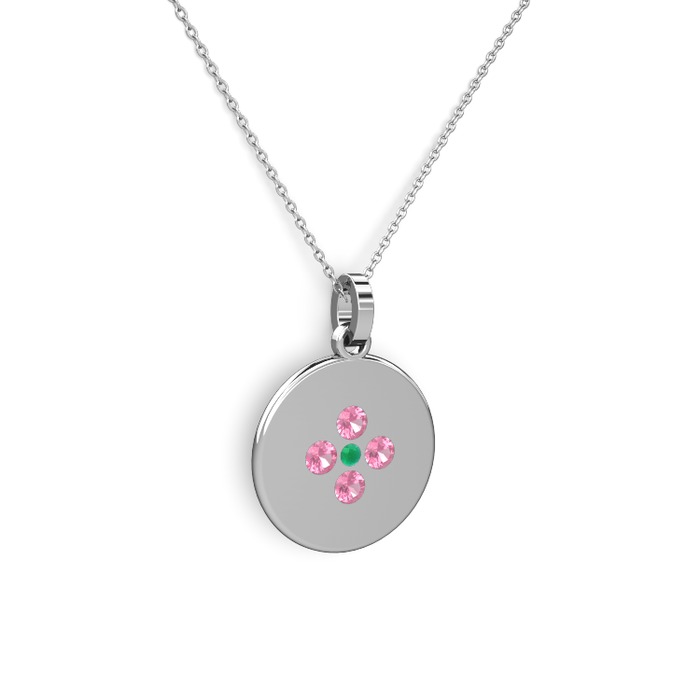 Kök zümrüt ve pembe kuvars 14 ayar beyaz altın kolye (40 cm beyaz altın rolo zincir)