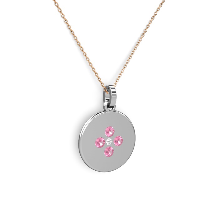 Swarovski ve pembe kuvars 18 ayar beyaz altın kolye (40 cm rose altın rolo zincir)
