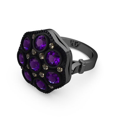 Ametist ve dumanlı kuvars 925 ayar siyah rodyum kaplama gümüş yüzük