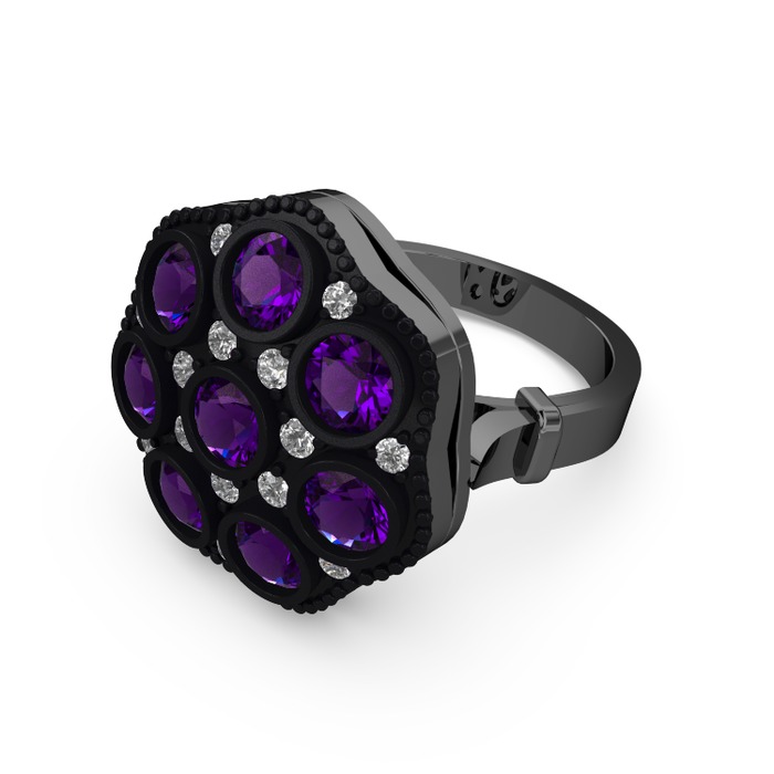 Ametist ve pırlanta 925 ayar siyah rodyum kaplama gümüş yüzük (0.3 karat)