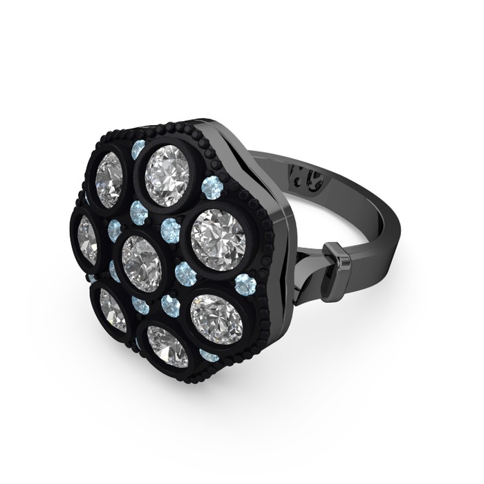 Beyaz zirkon ve akuamarin 925 ayar siyah rodyum kaplama gümüş yüzük