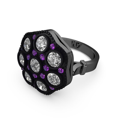 Elmas ve ametist 925 ayar siyah rodyum kaplama gümüş yüzük (1.68 karat)