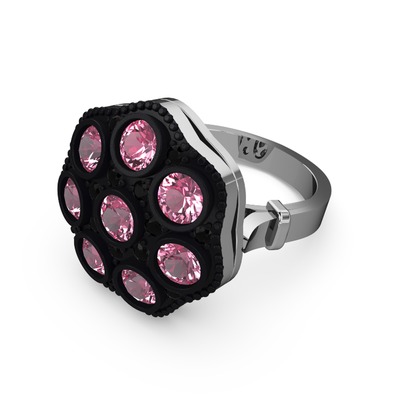 Pembe kuvars ve siyah zirkon 8 ayar beyaz altın yüzük