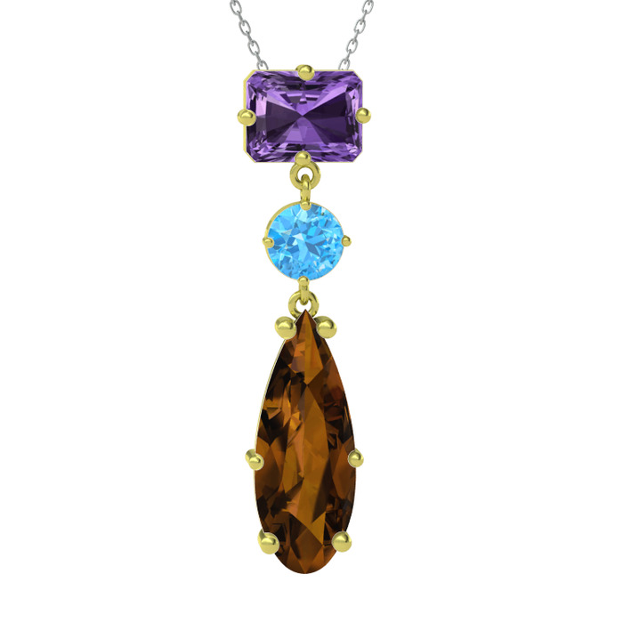 Ametist, akuamarin ve dumanlı kuvars 18 ayar altın kolye (40 cm gümüş rolo zincir)