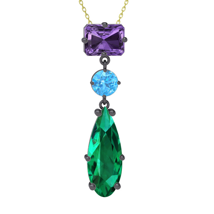 Ametist, akuamarin ve yeşil kuvars 925 ayar siyah rodyum kaplama gümüş kolye (40 cm altın rolo zincir)