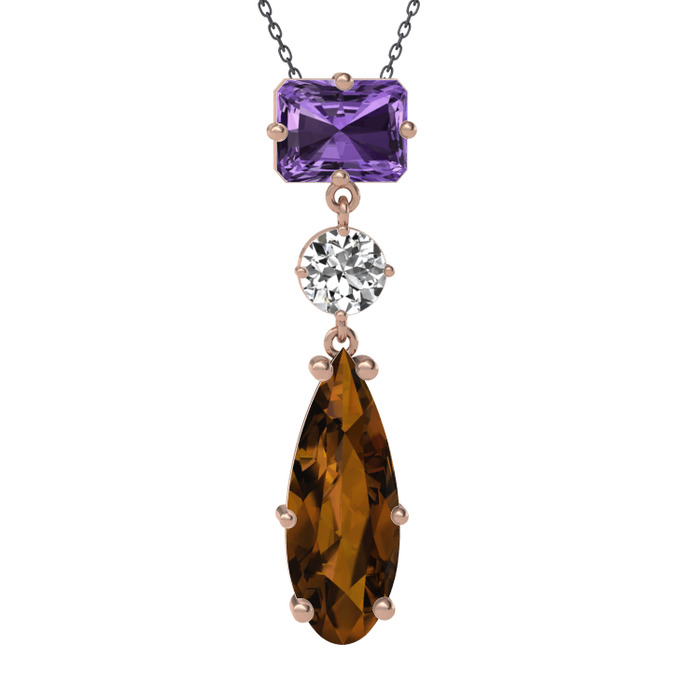 Ametist, beyaz zirkon ve dumanlı kuvars 8 ayar rose altın kolye (40 cm gümüş rolo zincir)