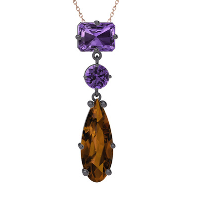 Ametist ve dumanlı kuvars 925 ayar siyah rodyum kaplama gümüş kolye (40 cm rose altın rolo zincir)
