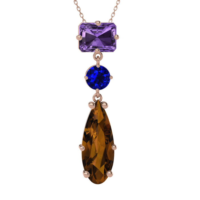 Ametist, lab safir ve dumanlı kuvars 925 ayar rose altın kaplama gümüş kolye (40 cm gümüş rolo zincir)