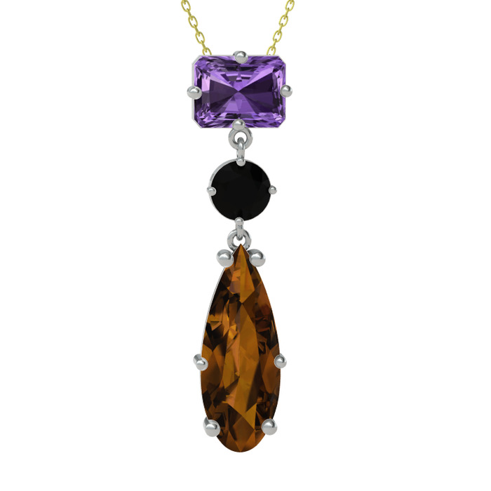 Ametist, siyah zirkon ve dumanlı kuvars 8 ayar beyaz altın kolye (40 cm altın rolo zincir)