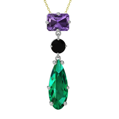 Ametist, siyah zirkon ve yeşil kuvars 8 ayar beyaz altın kolye (40 cm gümüş rolo zincir)