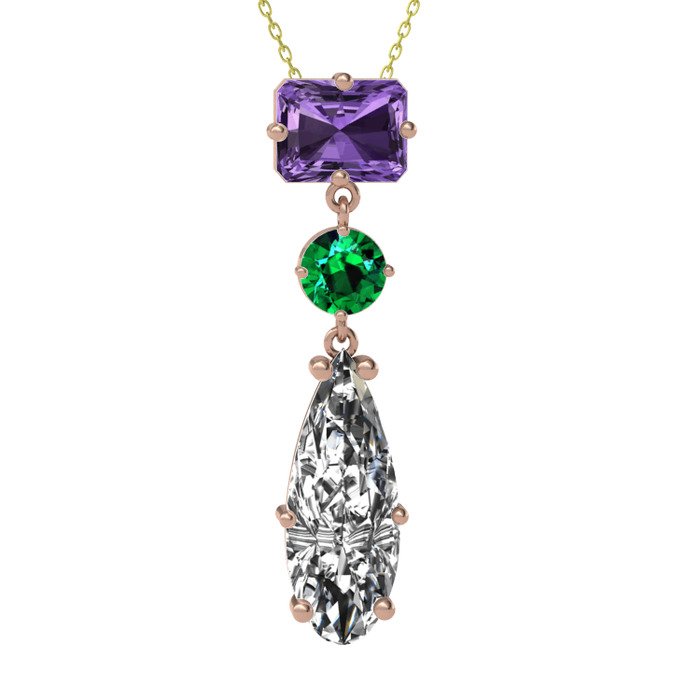 Ametist, yeşil kuvars ve beyaz zirkon 925 ayar rose altın kaplama gümüş kolye (40 cm altın rolo zincir)
