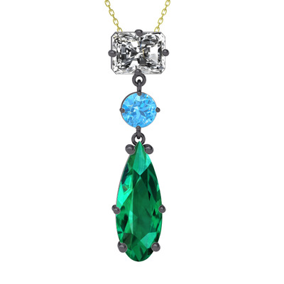 Beyaz zirkon, akuamarin ve yeşil kuvars 925 ayar siyah rodyum kaplama gümüş kolye (40 cm altın rolo zincir)