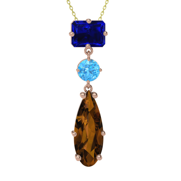 Lab safir, akuamarin ve dumanlı kuvars 18 ayar rose altın kolye (40 cm altın rolo zincir)