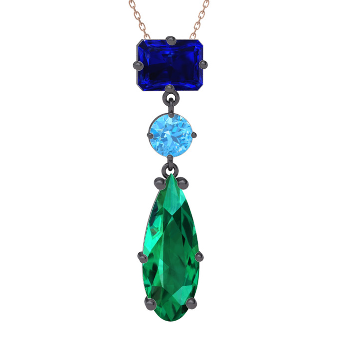 Lab safir, akuamarin ve yeşil kuvars 925 ayar siyah rodyum kaplama gümüş kolye (40 cm rose altın rolo zincir)