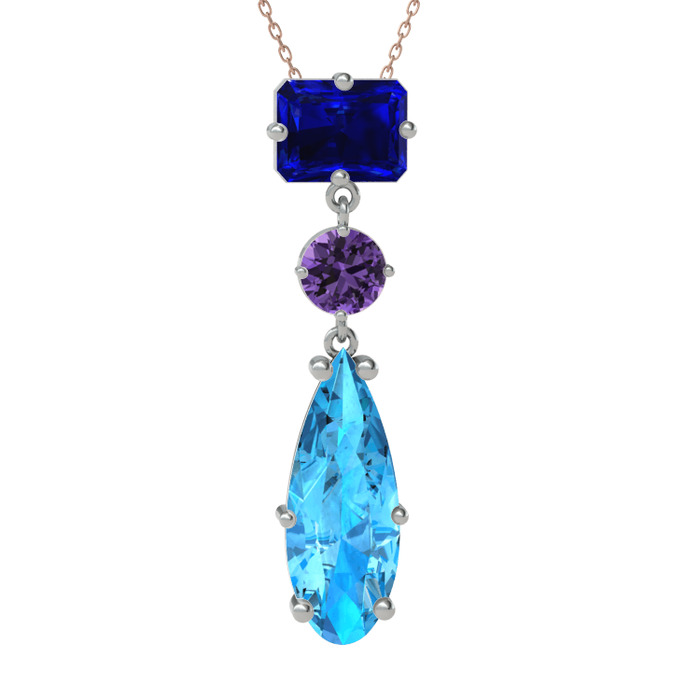Lab safir, ametist ve akuamarin 14 ayar beyaz altın kolye (40 cm rose altın rolo zincir)