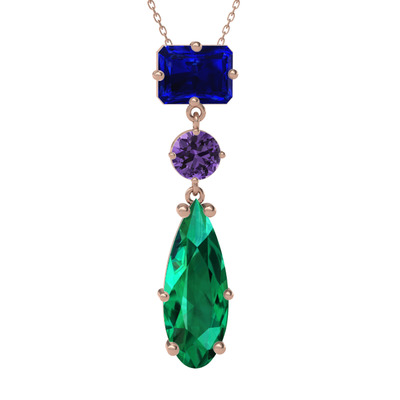 Lab safir, ametist ve yeşil kuvars 14 ayar rose altın kolye (40 cm rose altın rolo zincir)