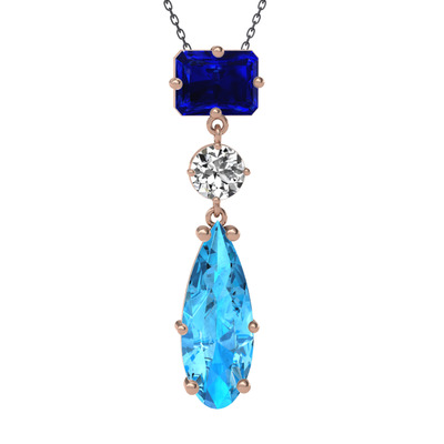 Lab safir, beyaz zirkon ve akuamarin 14 ayar rose altın kolye (40 cm gümüş rolo zincir)