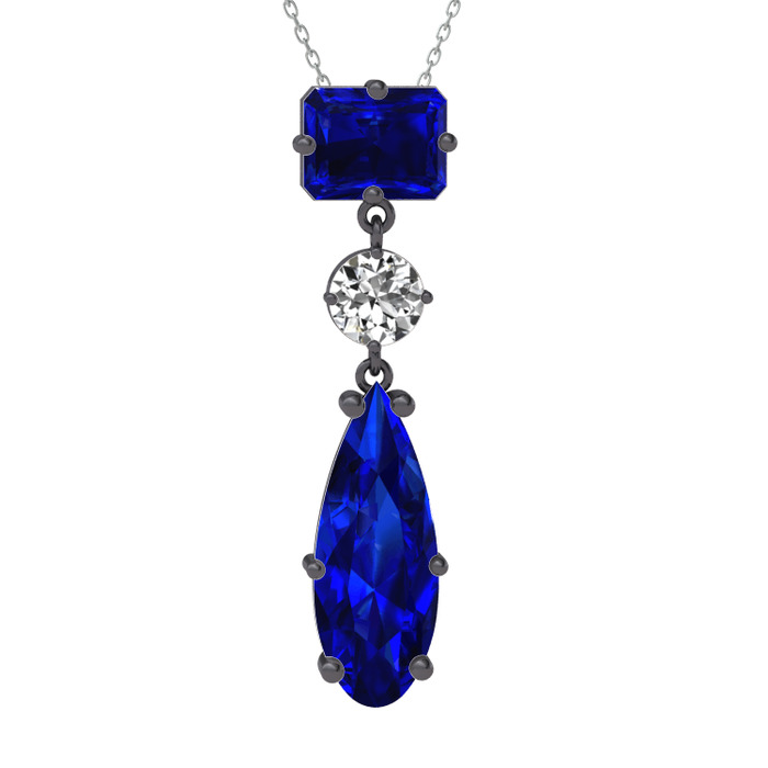 Lab safir ve beyaz zirkon 925 ayar siyah rodyum kaplama gümüş kolye (40 cm beyaz altın rolo zincir)