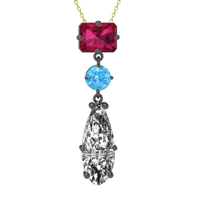 Rodolit garnet, akuamarin ve beyaz zirkon 925 ayar siyah rodyum kaplama gümüş kolye (40 cm gümüş rolo zincir)
