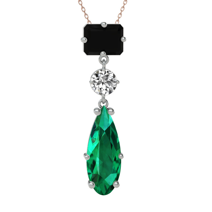 Siyah zirkon, beyaz zirkon ve yeşil kuvars 8 ayar beyaz altın kolye (40 cm gümüş rolo zincir)