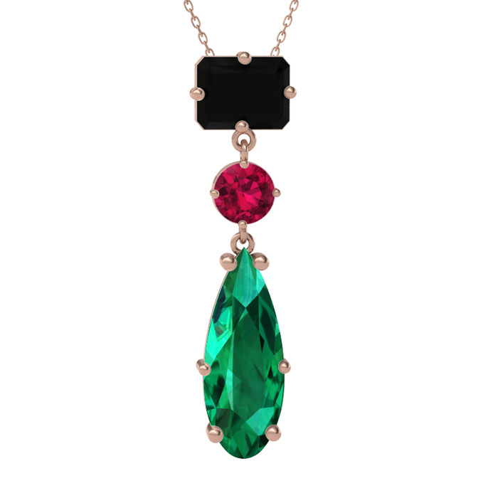 Siyah zirkon, rodolit garnet ve yeşil kuvars 14 ayar rose altın kolye (40 cm rose altın rolo zincir)