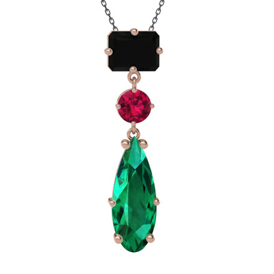Siyah zirkon, rodolit garnet ve yeşil kuvars 925 ayar rose altın kaplama gümüş kolye (40 cm gümüş rolo zincir)