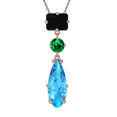 Siyah zirkon, yeşil kuvars ve akuamarin 8 ayar rose altın kolye (40 cm gümüş rolo zincir)