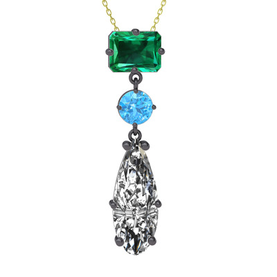 Yeşil kuvars, akuamarin ve beyaz zirkon 925 ayar siyah rodyum kaplama gümüş kolye (40 cm altın rolo zincir)