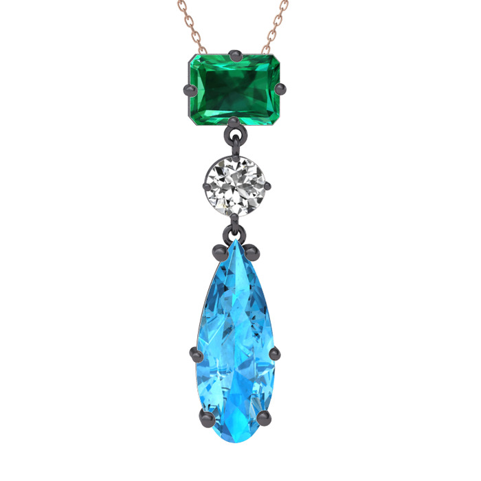 Yeşil kuvars, beyaz zirkon ve akuamarin 925 ayar siyah rodyum kaplama gümüş kolye (40 cm rose altın rolo zincir)