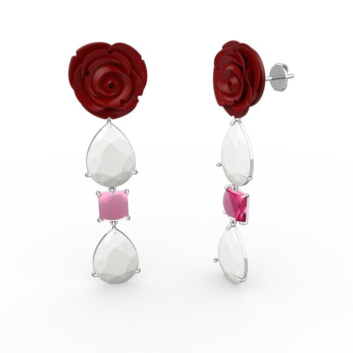 Beyaz akrilik ve pembe kuvars 8 ayar beyaz altın küpe (Kırmızı mineli)