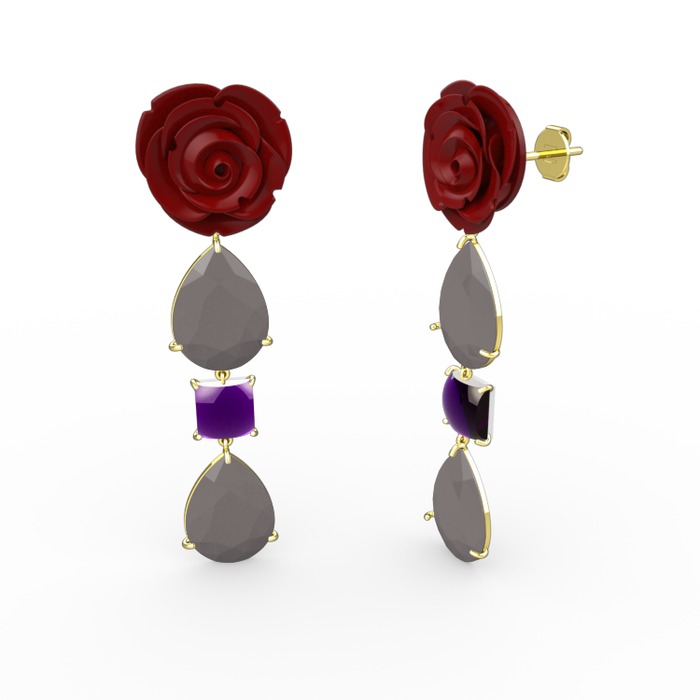Füme akrilik ve ametist 8 ayar altın küpe (Kırmızı mineli)