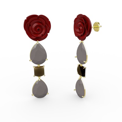 Füme akrilik ve dumanlı kuvars 8 ayar altın küpe (Kırmızı mineli)