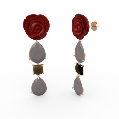 Füme akrilik ve dumanlı kuvars 925 ayar rose altın kaplama gümüş küpe (Kırmızı mineli)
