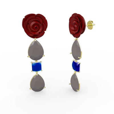 Füme akrilik ve lab safir 925 ayar altın kaplama gümüş küpe (Kırmızı mineli)
