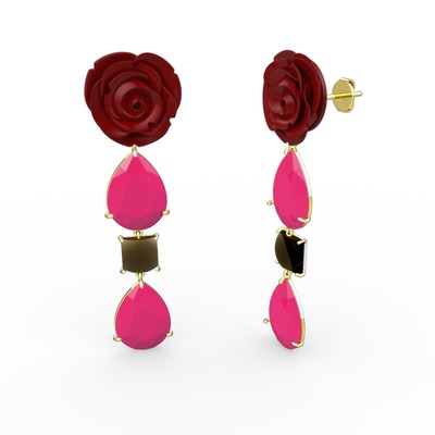 Neon pembe akrilik ve dumanlı kuvars 18 ayar altın küpe (Kırmızı mineli)