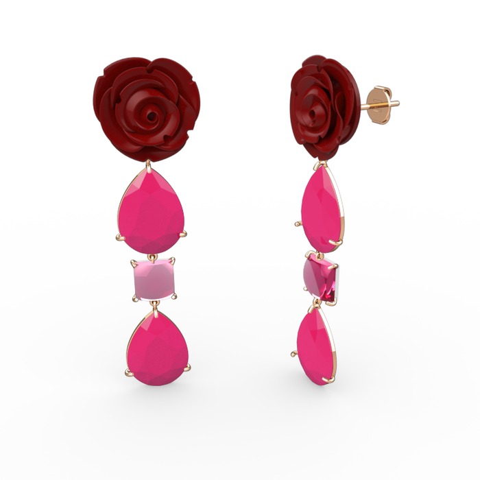 Neon pembe akrilik ve pembe kuvars 18 ayar rose altın küpe (Kırmızı mineli)