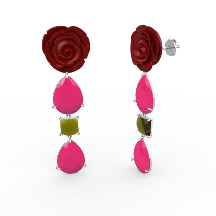 Neon pembe akrilik ve peridot 925 ayar gümüş küpe (Kırmızı mineli)
