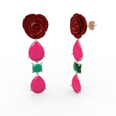 Neon pembe akrilik ve yeşil kuvars 18 ayar rose altın küpe (Kırmızı mineli)