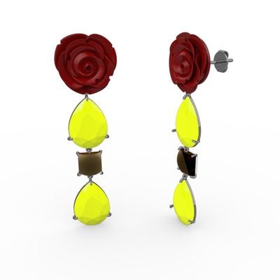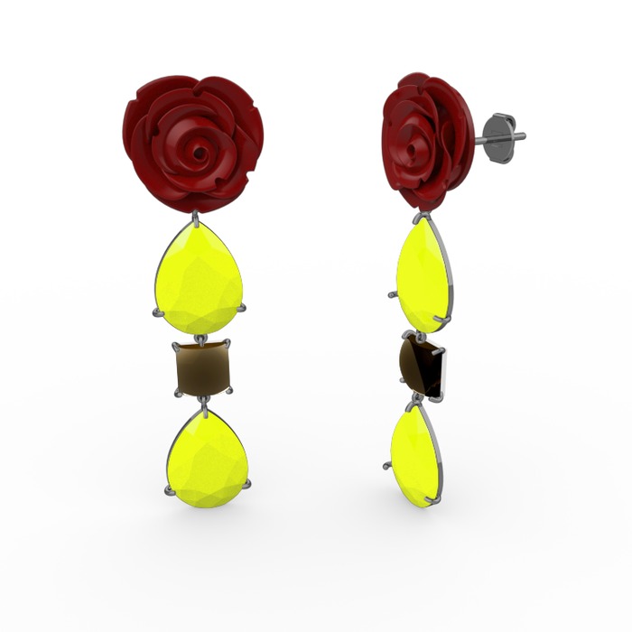 Neon sarı akrilik ve dumanlı kuvars 925 ayar siyah rodyum kaplama gümüş küpe (Kırmızı mineli)