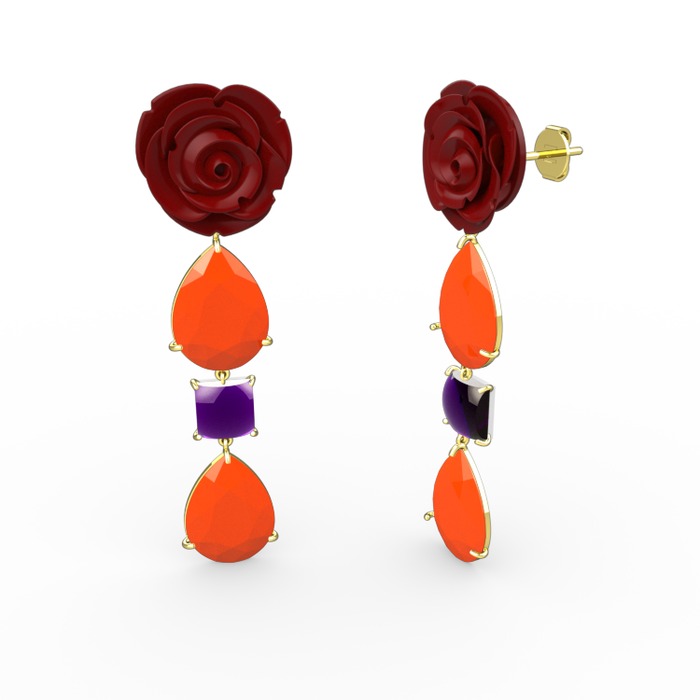 Neon turuncu akrilik ve ametist 14 ayar altın küpe (Kırmızı mineli)