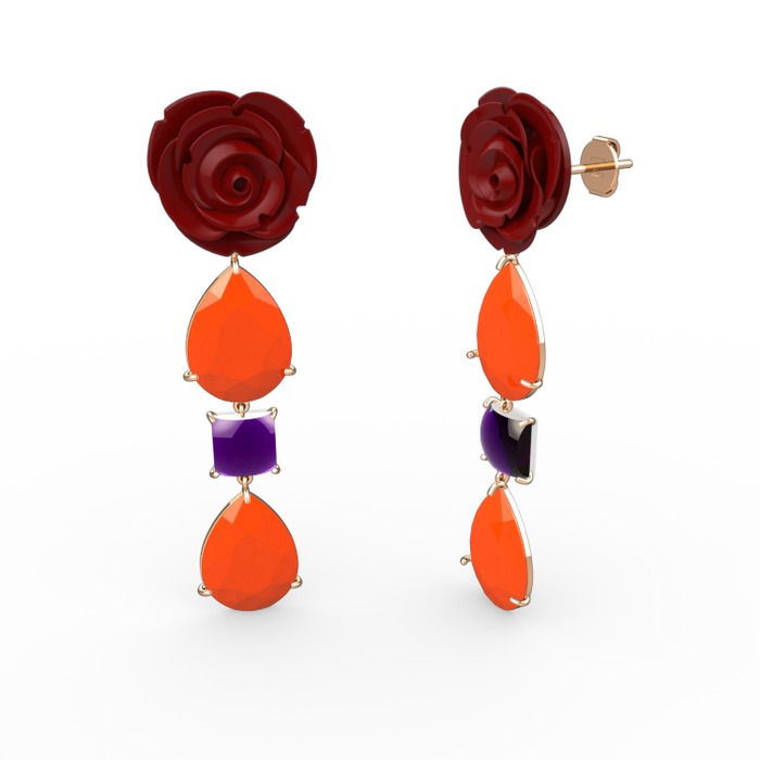 Neon turuncu akrilik ve ametist 14 ayar rose altın küpe (Kırmızı mineli)