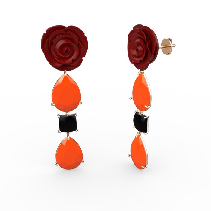 Neon turuncu akrilik ve siyah zirkon 14 ayar rose altın küpe (Kırmızı mineli)