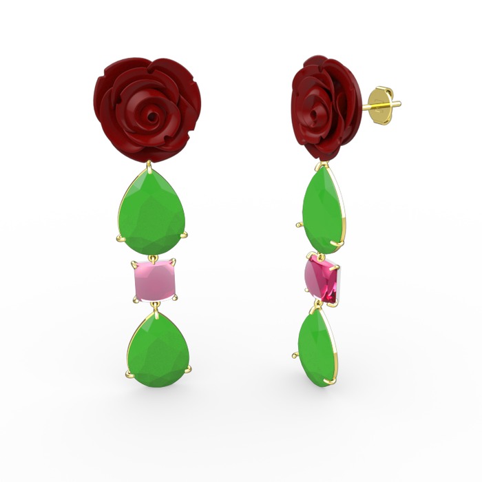 Neon yeşil akrilik ve pembe kuvars 8 ayar altın küpe (Kırmızı mineli)