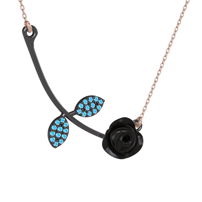 Akuamarin 925 ayar siyah rodyum kaplama gümüş kolye (Siyah mineli, 40 cm rose altın rolo zincir)