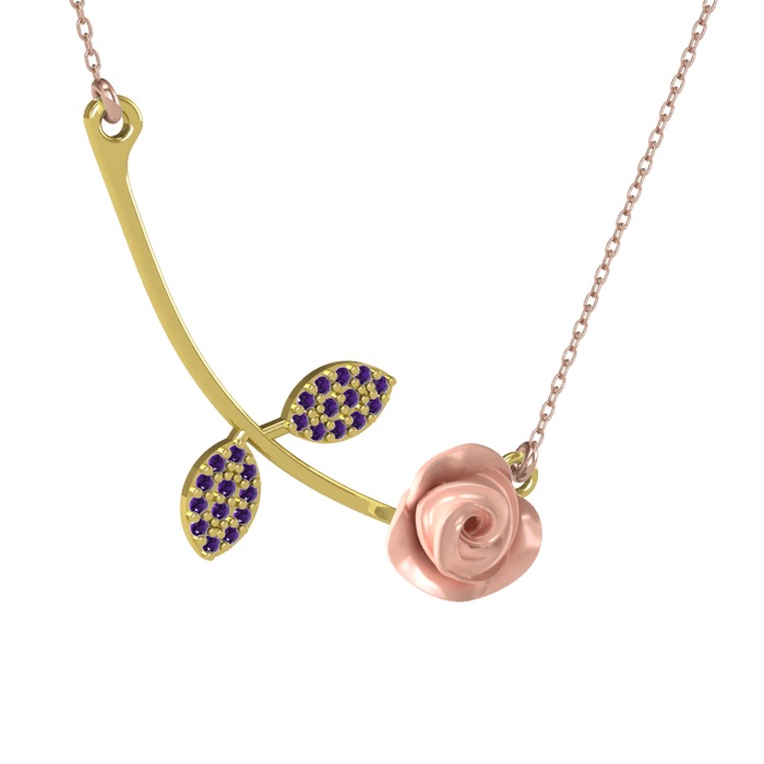 Ametist 925 ayar altın kaplama gümüş kolye (Pembe mineli, 40 cm rose altın rolo zincir)