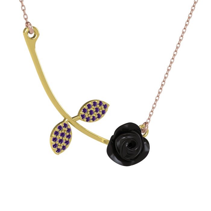 Ametist 925 ayar altın kaplama gümüş kolye (Siyah mineli, 40 cm rose altın rolo zincir)